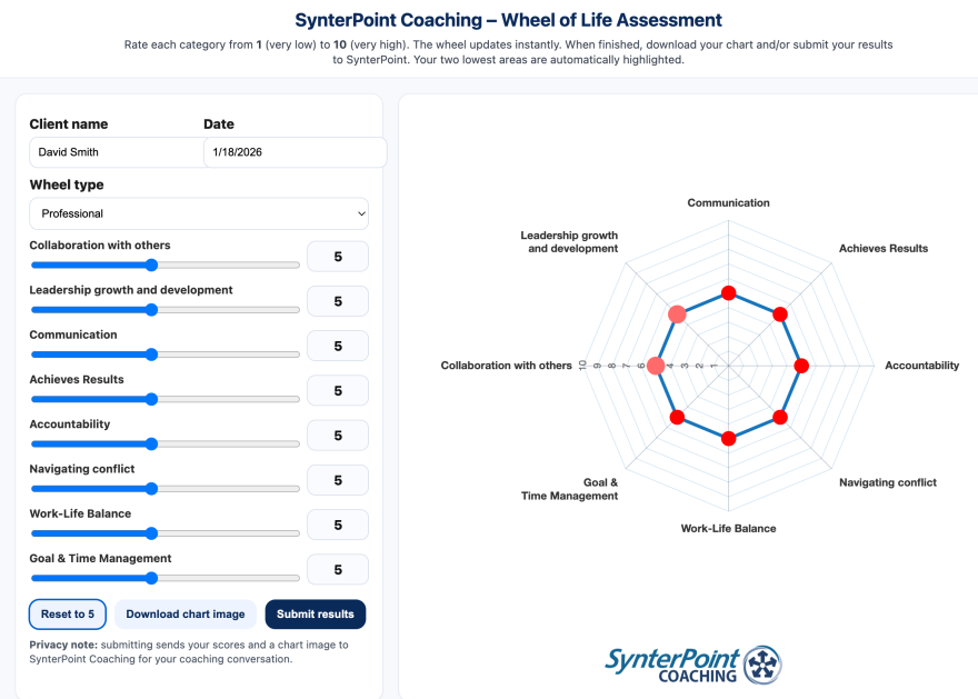 As we begin our journey together, take a few minutes and self-assess yourself on your professional and personal well-being. Once you have scored yourself on the first assessment, click on downloard chart image. Take a screen shot and save it to your device and email it to your coach by clicking here